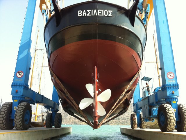 Μετά τον κατάπλου στο λιμάνι της Κοιλάδας Αργολίδας και την ασφαλή διέλευσή του για την είσοδό στον δίαυλο και την νηοδόχο του ναυπηγείου μας, ανελκύσθηκε και καθελκύσθηκε στις εγκαταστάσεις μας το σιδερένιο αλιευτικό επαγγελματικό πλοίο ΒΑΣΙΛΕΙΟΣ νηολογίου Χανίων, μήκους 29 μ. - βάθους 3,60 μ. – βάρους 200 τόνων, για την προγραμματισμένη του συντήρηση (Καρνάγιο)